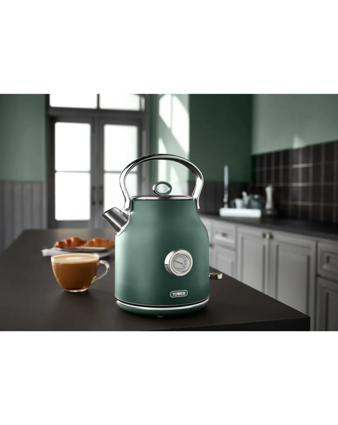 Boil the perfect brew in less than a minute with the Tower 3KW Forest Green Kettle. The 1.7L capacity lets you make up to 7 cups of tea or coffee from one fill, perfect when hosting your family and friends. Designed to prevent messy spills when making your brew, the perfect pour and easy fill spout makes for a more convenient all-round kettle. Keep the cuppas flowing without any distraction using the kettles quiet boil function- ideal for morning brews when youre trying not to wake the family. The stylish design of this kettle will make a statement on your kitchen countertop, adding a touch of class to your electrical appliances and fits perfectly with the Tower Renaissance Forest Green 4 Slice Toaster.