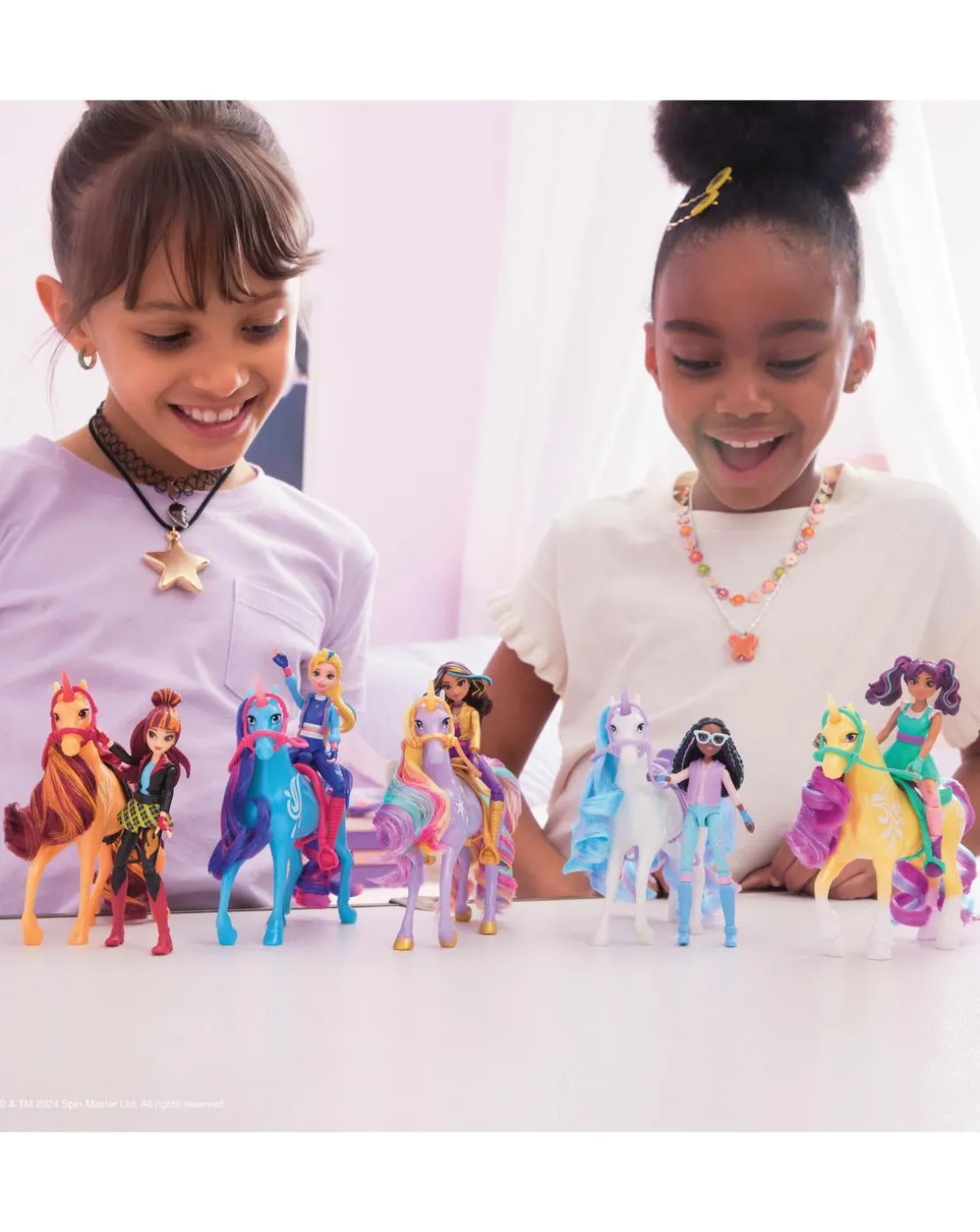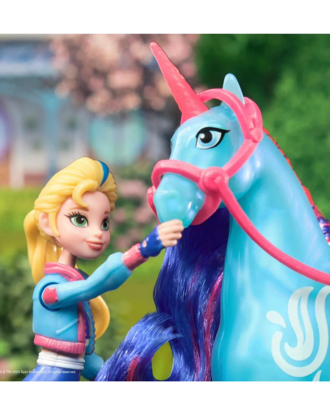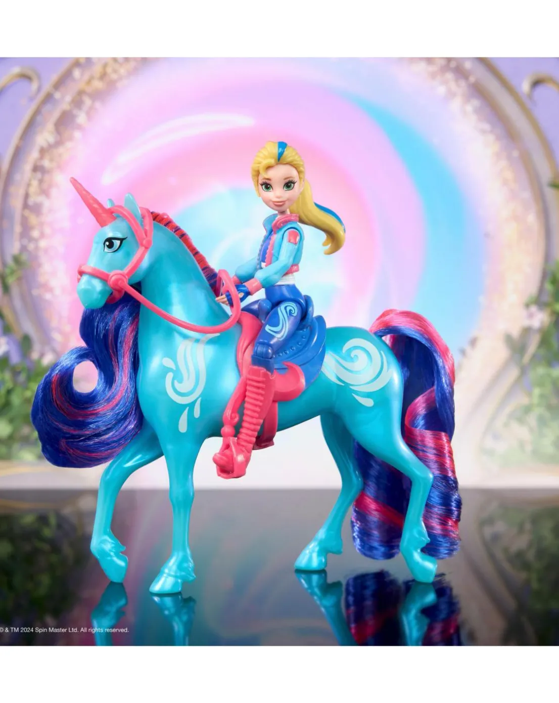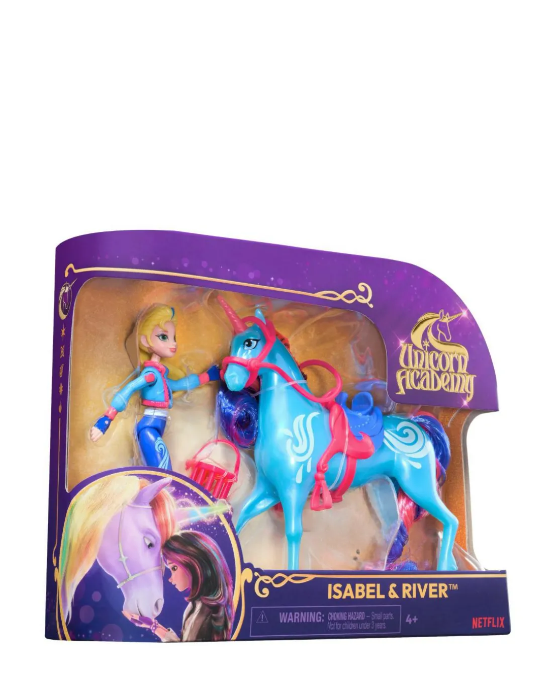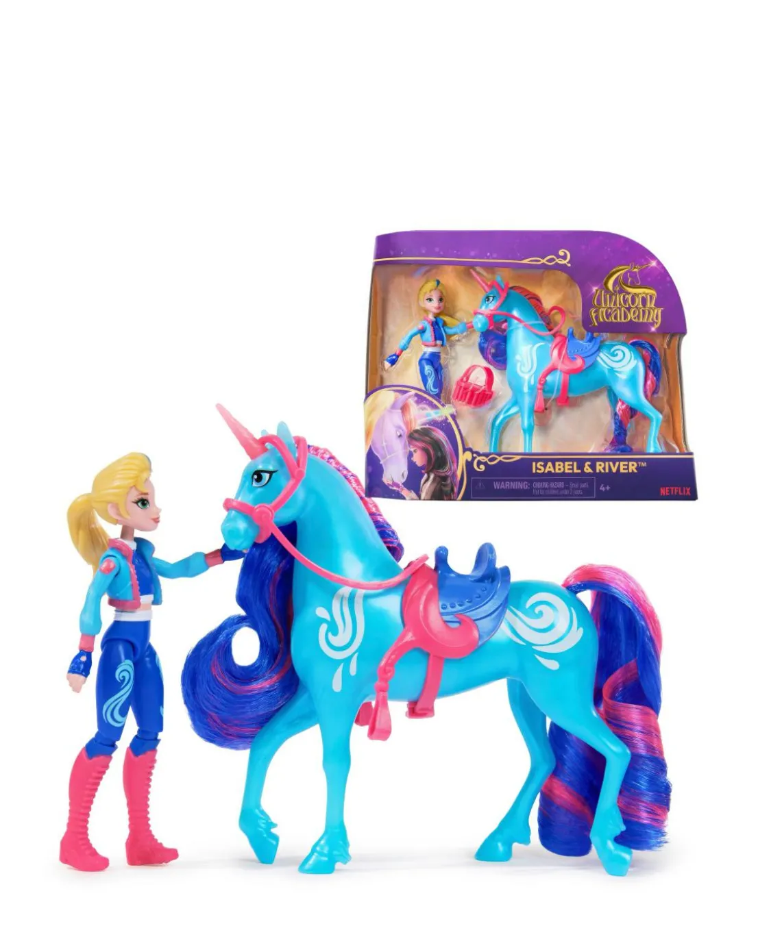 Celebrate the bond between rider and unicorn with the Unicorn Academy Isabel & River Set. Inspired by the NETFLIX animated show and best-selling book series where friendship reins, this set will spark endless imaginative storytelling. 11.4cm Isabel features realistic true-to-show details and 7 points of articulation for dynamic poses. River stands at 12.7cm tall, complementing Isabel’s look with Water Magic markings and brushable blue and pink mane and tail (brush included). As you play, pose Isabel to sit on River and ride into adventure. With the removable bridle and saddle accessories, Isabel can securely stay in place on River. For more ways to experience Unicorn Academy with your favourite characters, look for the other small dolls, including Sophia, Ava, Layla, Valentina and their unicorns (sets sold separately) and expand your world. For kids who enjoy unicorns and horse toys, dolls and accessories, doll house play, collectibles, plush toys and more, Unicorn Academy toys are fun birthday gifts for girls or gifts for any occasion. Experience enchanting Unicorn Academy adventures with the Isabel & River Set.